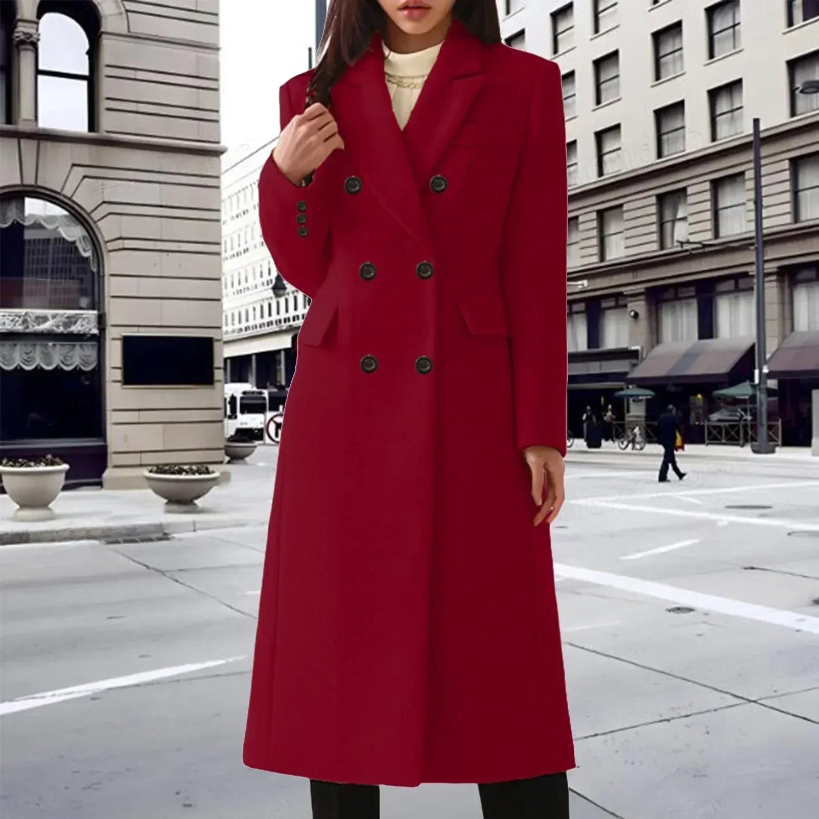 Women's Fashion Casual Long Double Breasted Solid Woolen Coat With Pockets Woolen Coat